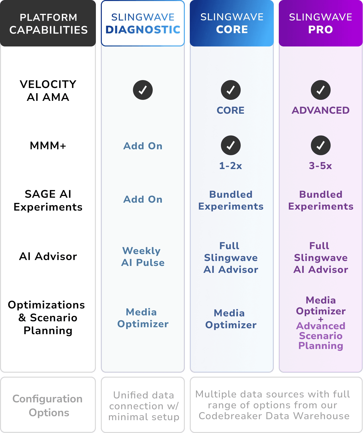most advanced offering, combining MMM+ Media Mix Modeling, VELOCITY AI Agile Marketing Attribution, SAGE AI Experimentation, and Slingshot AI Media Activation into one